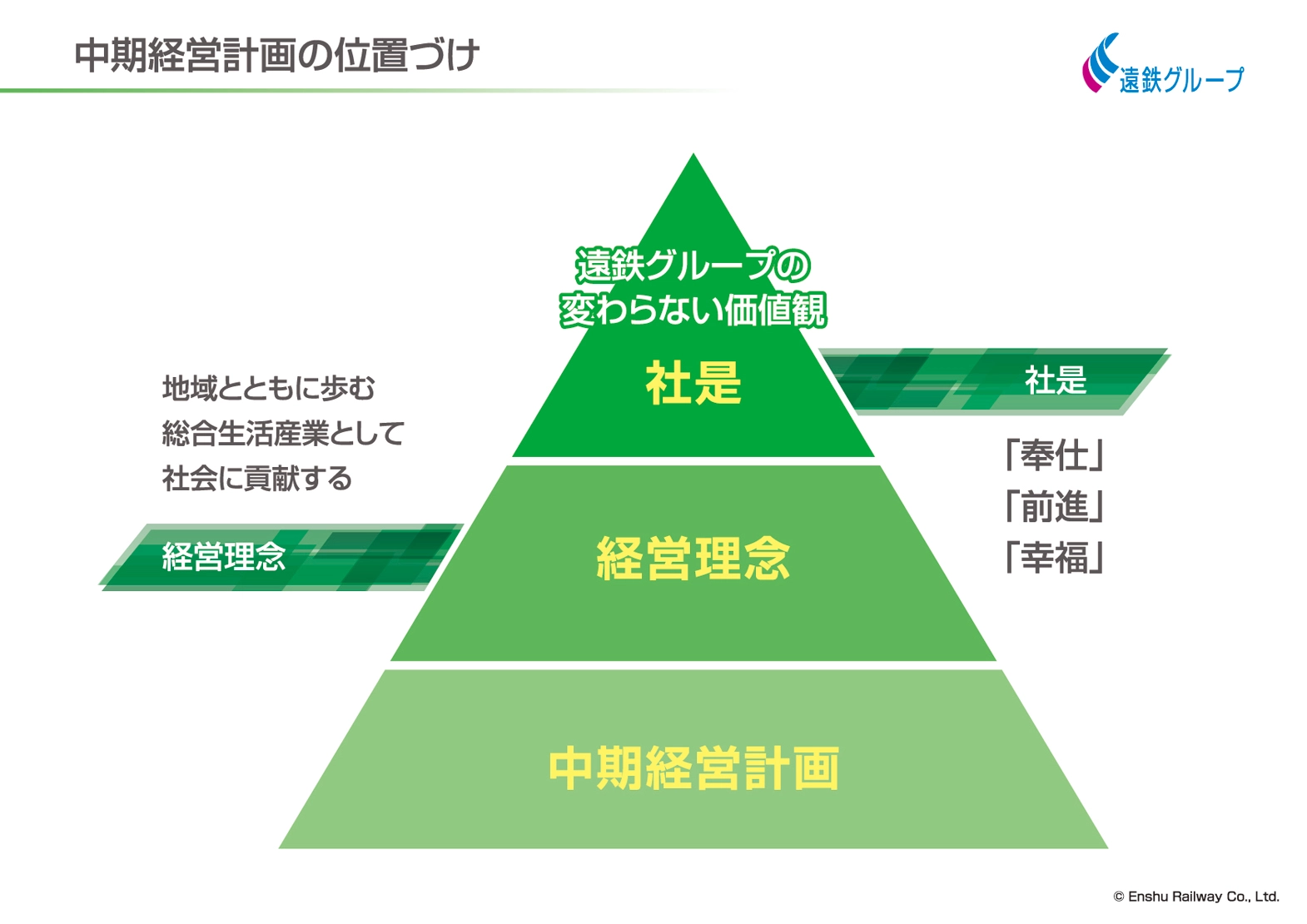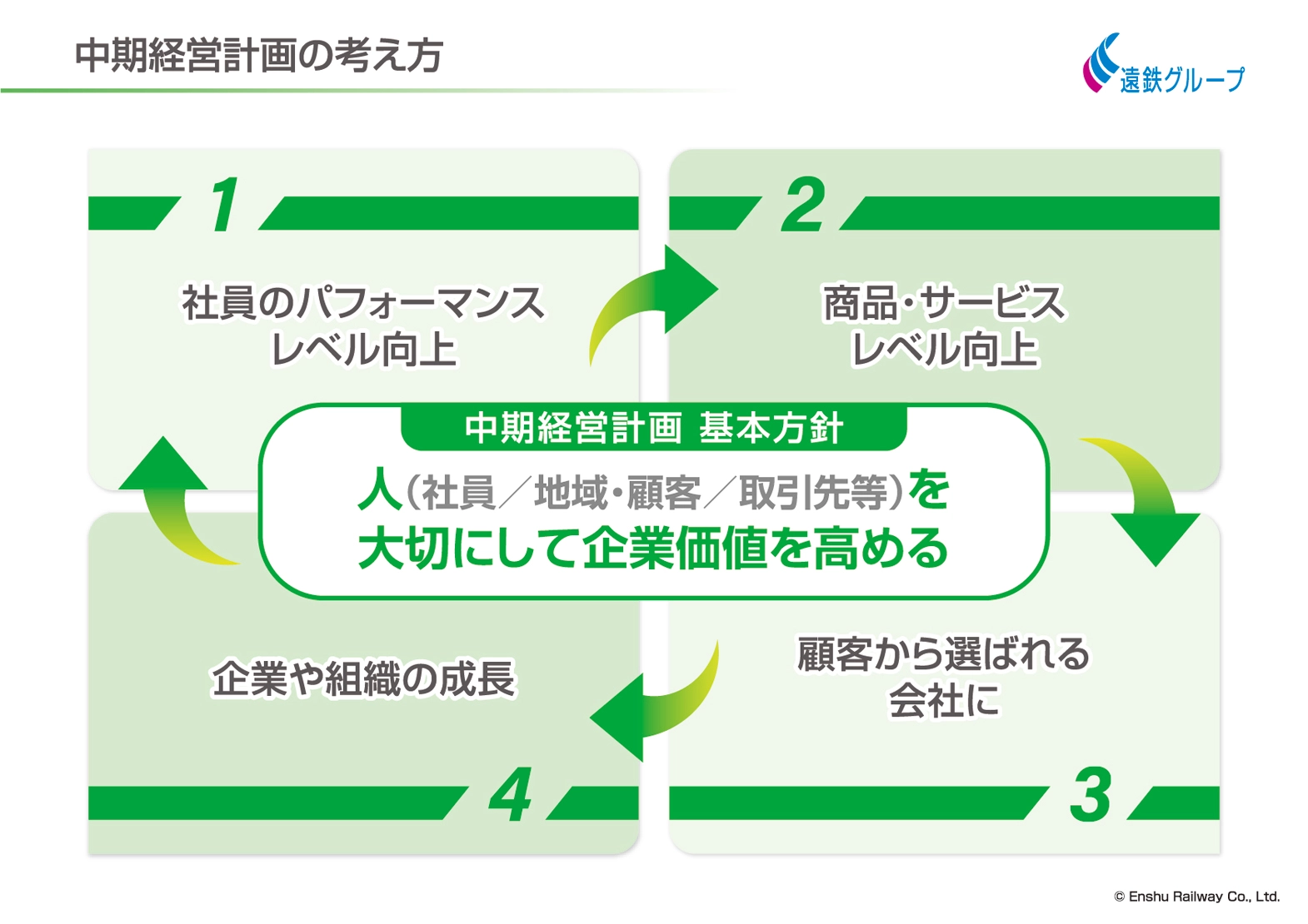 私たちは、「社員からも顧客からも選ばれる会社」を目指しており、その中心に「人」を据えています。遠鉄グループの中期経営計画において、基本方針としても「人(社員・地域・顧客・取引先等)を大切にして企業価値を高める」を掲げており、これは私の強い信念でもあります。