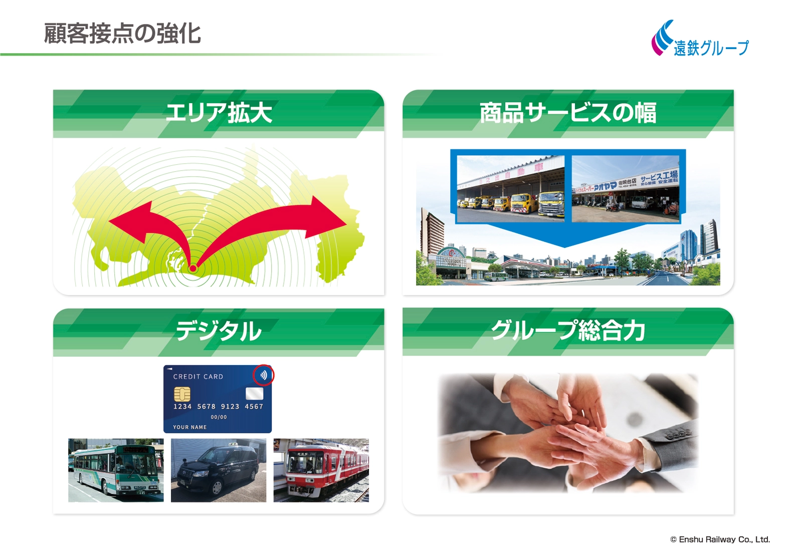 私たち遠州鉄道は、鉄道やバスなどの運輸事業を中心に培われてきた「信頼」を基に、不動産事業、保険代理業、介護事業などを営み成長してまいりました。さらにグループとしては多角経営を進め、地域の皆様の生活に密着した幅広い事業を展開するグループ事業体へと「地域とともに歩む総合生活産業として社会に貢献する」という経営理念のもと発展を遂げてまいりました。